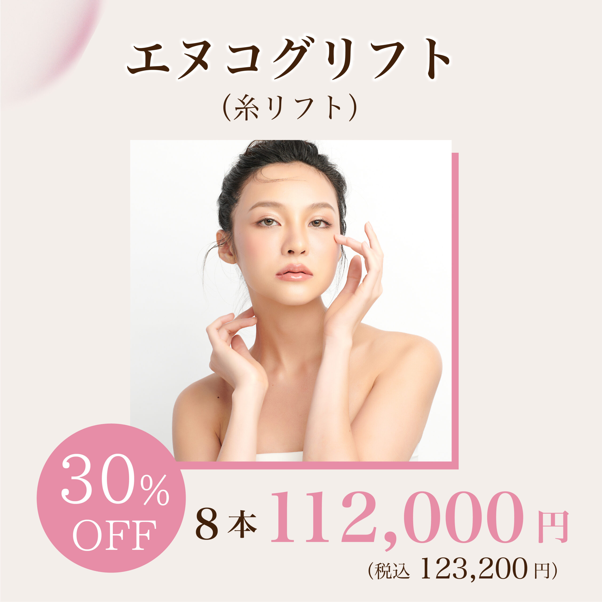 糸リフト(エヌコグリフト)とは、溶ける糸をたるみの気になる部分に挿入し、コグの力でリフトアップする施術です。当院でも人気のエヌコグリフトが、今回30%OFFになるキャンペーンを開催!